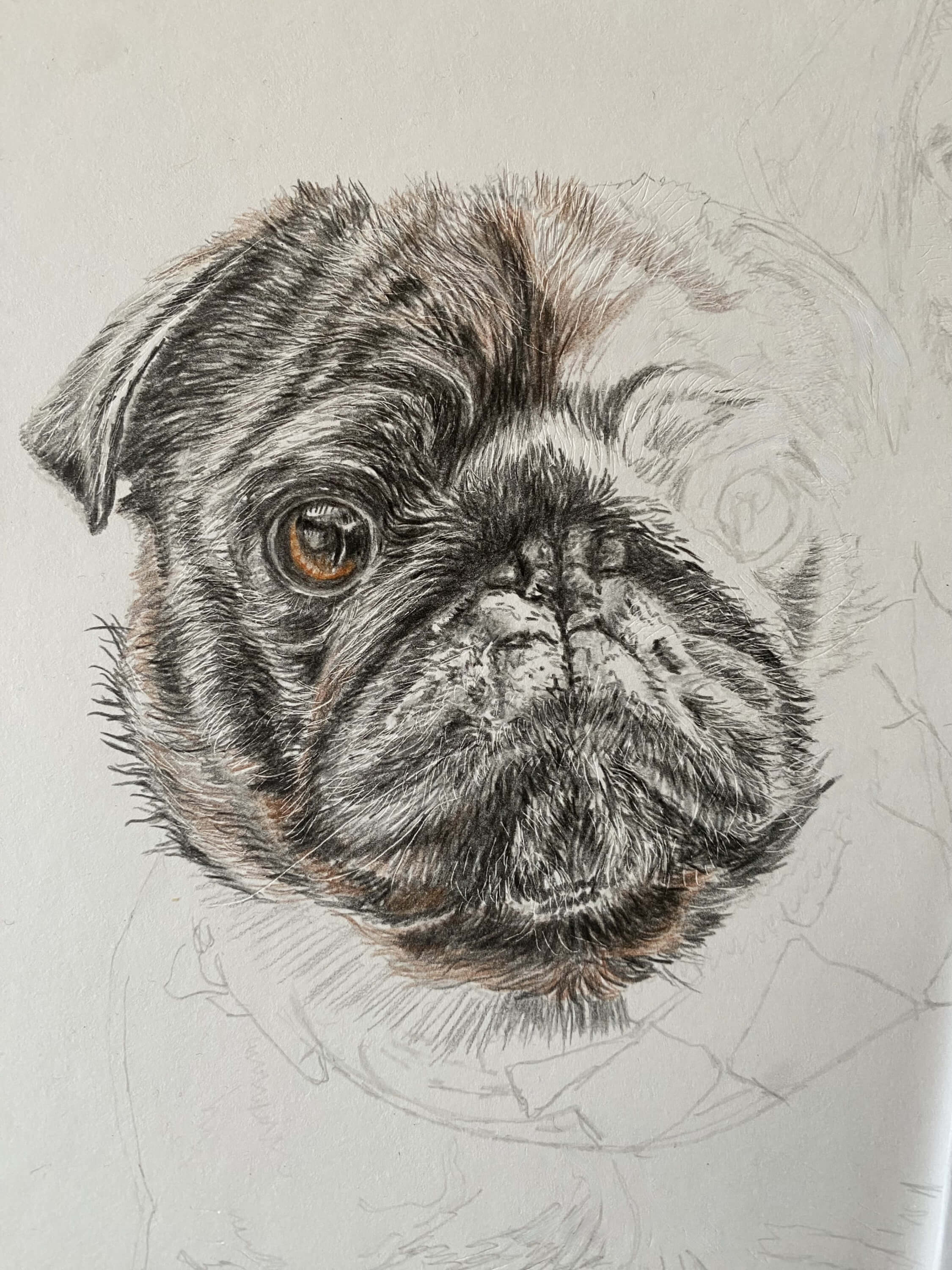 De witte haartjes zijn uitgespaard. Dus niet achteraf met een witte pen of stift toegevoegd. Dat zou het misschien wel makkelijker maken, maar dit is nou eenmaal de methode zoals ik werk. Dat komt ook omdat het wel eens verkeerd is gegaan.